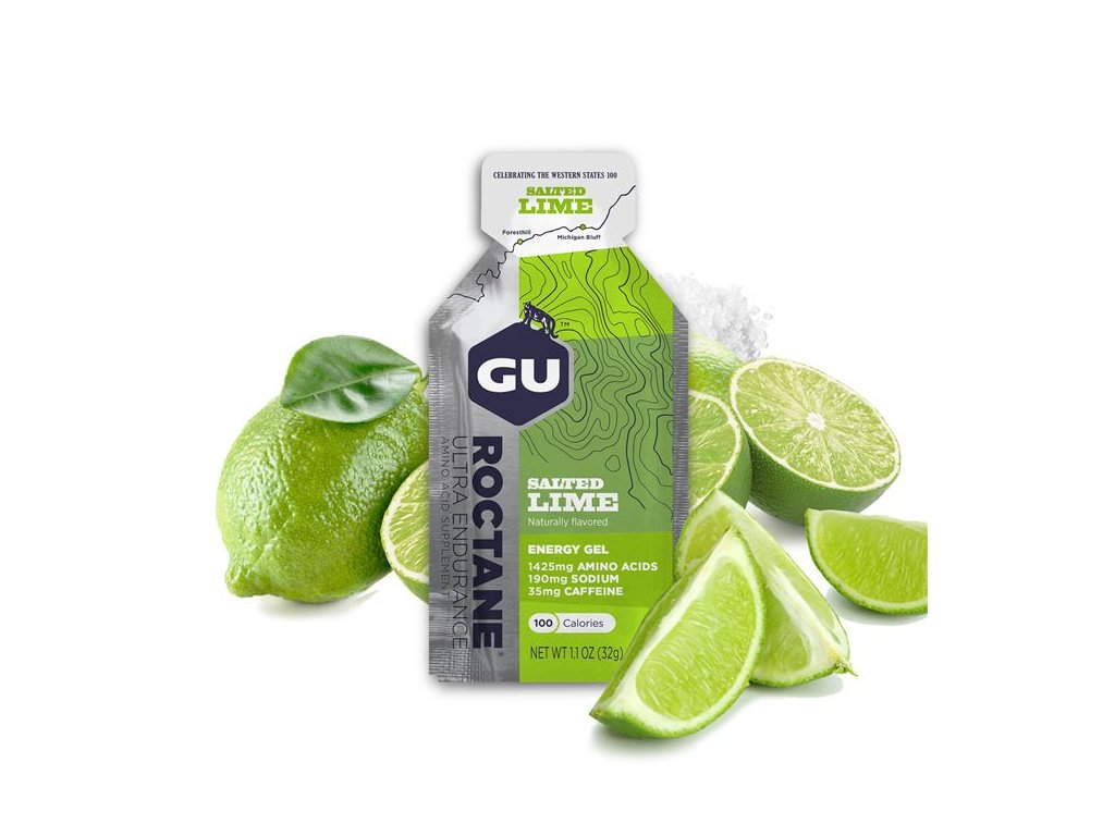 Jedinečný zdroj potřebných živin a energie pro dlouhé vzdálenosti a extrémní výkony, zejména v závodech. V pouhých 100 kaloriích je obsaženo 1 425 mg větvených aminokyselin leucin, valin a isoleucin. Ve srovnání s GU gelem obsahuje mnohem více esenciálních aminokyselin, které si tělo samo nedokáže syntetizovat, ale potřebuje je k ochraně svalových vláken při fyzickém výknu. Ornithine alpha-ketaglutarat (OKG) blokuje nežádoucí katabolické procesy (svalové křeče). Obsah 35 mg kofeinu stimuluje nervovou soustavu k lepší koncentraci. Stejné použití jako GU gel, ale s mnohem vyšším účinkem, který vás rychleji dovede dál. Energetický gel ROCTANE obsahuje 3x více BCAA a 2x víc elektrolytů ve srovnání s našimi původními energetickými gely. Obsahují také aminokyseliny taurin (pomáhají udržovat stažitelnost srdce a zlepšují srdeční výdej během dlouhých cvičení) a beta-alanin (pomáhá udržovat stabilní ph uvnitř buněk a tím zabránit jejich poškození). Energetické gely ROCTANE dodávají stejnou kombinaci sacharidů a stejný počet kalori jako Enery Gely. Energetické gely ROCTANE jsou klíčovým nástrojem pro vysokou intenzitu nebo dlouhodobou aktivitu, kdy dochází k rychlému vyčerpání živin a poškození svalů. Když jsme se rozhodli vytvořit novou příchuť gelu Roctane určenou speciálně pro tréninky a závody v horku, zeptali jsme se sportovců, po jaké příchuti v těchto podmínkách touží. Salted Lime byl jasným vítězem. Je to kyselý, lahodný výbuch čerstvé limetkové chuti se slaným nádechem, díky kterému se budete po dlouhou dobu cítit co nejlépe. Část tržeb navíc prospívá nadaci Western States Endurance Run Foundation NEOBSAHUJE LEPEK! OPTIMALIZOVANÝ ŘETĚZEC AMINOKYSELIN: Pro zvýšení výkonu, pozornosti a rychlosti regenerace, redukuje riziko svalových poškození a urychluje následnou regeneraci
