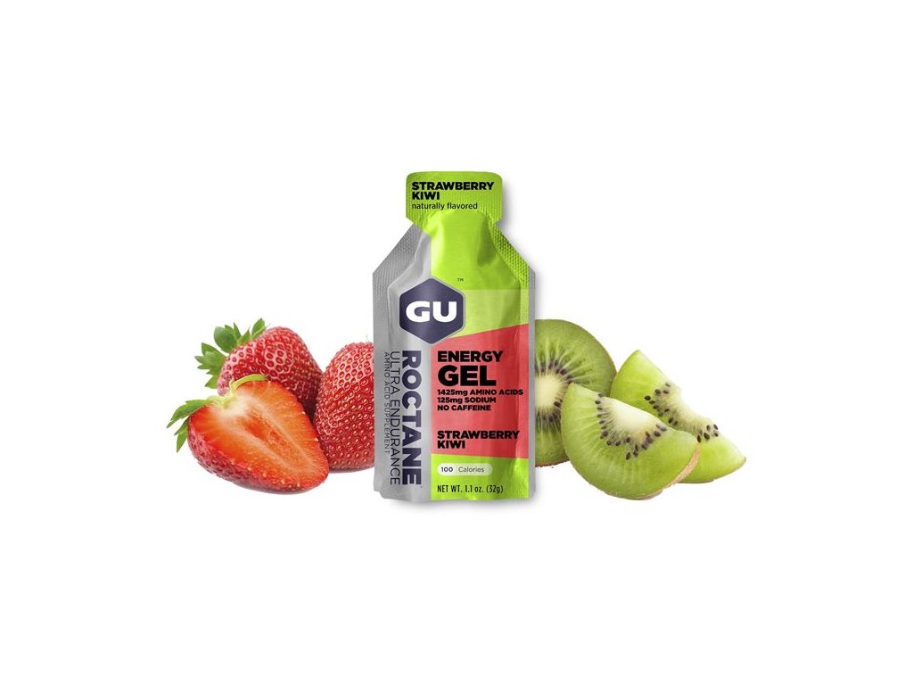 Jedinečný zdroj potřebných živin a energie pro dlouhé vzdálenosti a extrémní výkony, zejména v závodech. V pouhých 100 kaloriích je obsaženo 1 425 mg větvených aminokyselin leucin, valin a isoleucin. Ve srovnání s GU gelem obsahuje mnohem více esenciálních aminokyselin, které si tělo samo nedokáže syntetizovat, ale potřebuje je k ochraně svalových vláken při fyzickém výknu. Ornithine alpha-ketaglutarat (OKG) blokuje nežádoucí katabolické procesy (svalové křeče). Bez kofeinu. Stejné použití jako GU gel, ale s mnohem vyšším účinkem, který vás rychleji dovede dál. Energetický gel ROCTANE obsahuje 3x více BCAA a 2x víc elektrolytů ve srovnání s našimi původními energetickými gely. Obsahují také aminokyseliny taurin (pomáhají udržovat stažitelnost srdce a zlepšují srdeční výdej během dlouhých cvičení) a beta-alanin (pomáhá udržovat stabilní ph uvnitř buněk a tím zabránit jejich poškození). Energetické gely ROCTANE dodávají stejnou kombinaci sacharidů a stejný počet kalori jako Enery Gely. Energetické gely ROCTANE jsou klíčovým nástrojem pro vysokou intenzitu nebo dlouhodobou aktivitu, kdy dochází k rychlému vyčerpání živin a poškození svalů. Strawberry kiwi je přesně ta chuť, po které v létě toužíte. Není jen o dokonalém vyvážení chuti jahod a kiwi, ale také o správné sladkosti. Sáhněte po tomto gelu, pokud se chcete přenést do tropického ráje i během vyjížďky, běhu nebo jiného dobrodružství.